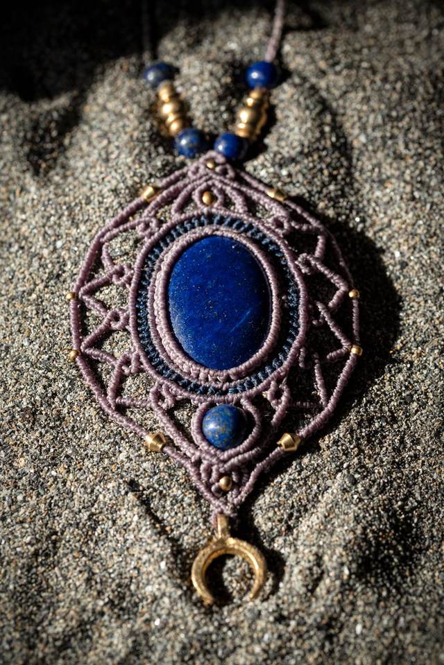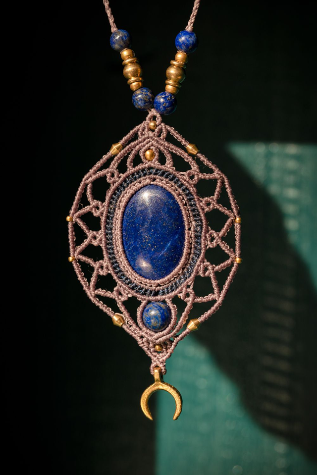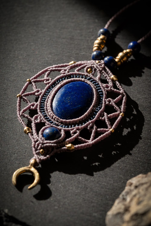 Nephthys évoque les profondeurs silencieuses du ciel étoilé et des temples oubliés. Talisman de mystère et de sagesse, il unit la puissance du lapis lazuli à un tissage macramé aux lignes délicates, pour accompagner les voyages intérieurs et protéger les âmes sensibles.